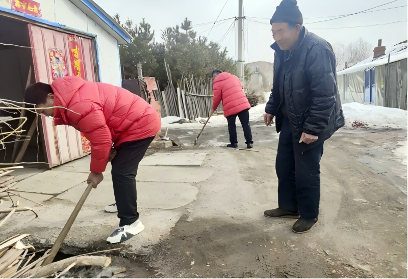 當?shù)竭_老黨員家中,此時老人正坐在房前劈柴,看到隊員們的到來熱情地招呼大家。隊員們有的主動從老人手上接過斧子劈起柴,并將劈好的柴火擺放整齊;有的拿起掃帚把院子掃得干干凈凈;有的找來長把斧子和鐵鍬在門前鑿開一條排水溝方便積水排水??粗麧嵉脑郝?、暢通的水溝和老人的笑容,隊員們勞動的成就感油然而生。