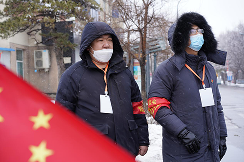 一場春雪,給這個(gè)被疫情所困擾的大地帶來了活力,一個(gè)個(gè)飽含“必贏”信心的字眼在雪中抒寫,冒雪堅(jiān)守抗“疫”一線的他們,依然是鏡頭下的主角。美人松下,小區(qū)隘口,身戴紅色袖標(biāo)的志愿者們,在雪的映襯下格外挺拔。